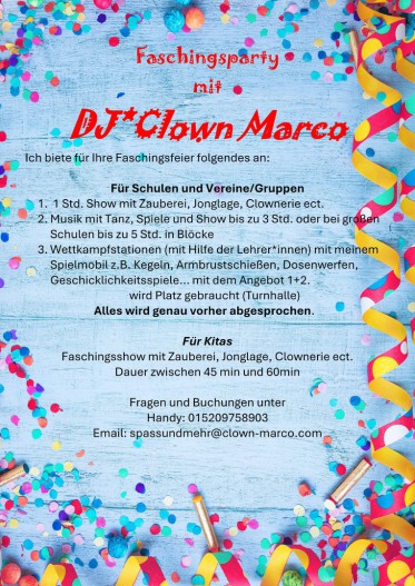 Sie benötigen einen professionellen Service, der schnell und individuell auf Ihre Bedürfnisse eingeht? Dann sind Sie bei Clown-Marco genau richtig. Ich helfe Ihnen gerne mit meinen kompetenten Leistungen weiter.